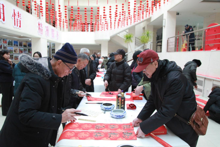 活動現(xiàn)場,紅紙鋪就,墨香氤氳,濃厚的年味撲面而來。書法家們揮灑自如,筆力遒勁,一幅幅充滿吉祥寓意的春聯(lián)和“?!弊周S然于紙。參與活動的老同志們或是駐足欣賞,或是協(xié)助書法家抻紙晾曬,更有不少即興揮毫,相互間品評筆法和韻味。歡聲笑語中,墨寶相贈,技藝切磋,溫情脈脈的互動間,展現(xiàn)了民族團結(jié)的深厚情誼。