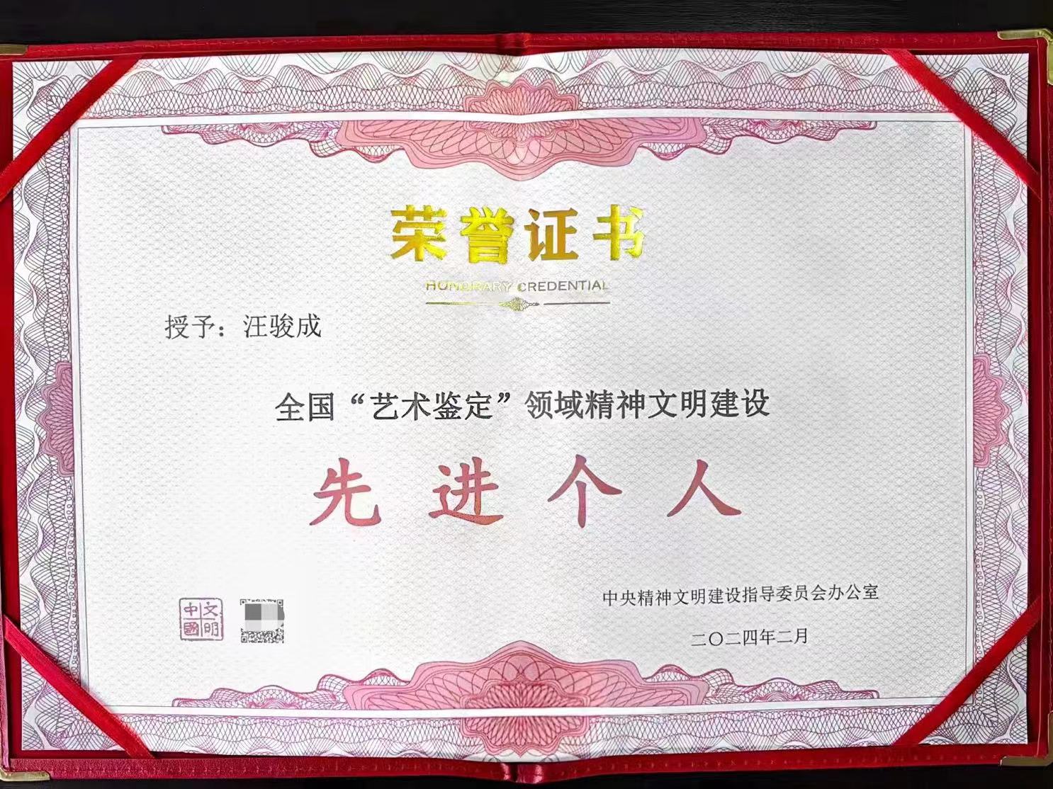 中宣部文明辦授予汪駿成全國(guó)藝術(shù)鑒定領(lǐng)域精神文明建設(shè)先進(jìn)個(gè)人榮譽(yù)稱號(hào)2