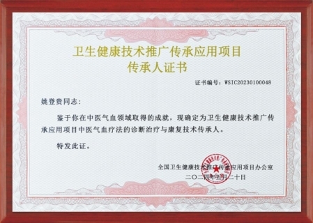 據(jù)了解,國家衛(wèi)生健康委流動人口服務(wù)中心是《全國衛(wèi)生健康技術(shù)推廣傳承應(yīng)用項目》的指導(dǎo)監(jiān)督單位。2024年5月20日,全國衛(wèi)生健康技術(shù)推廣傳承應(yīng)用項目辦公室為知名專家姚登貴頒發(fā)《衛(wèi)生健康技術(shù)推廣傳承應(yīng)用項目·傳承人證書》。這是國家衛(wèi)生健康委流動人口服務(wù)中心對中醫(yī)氣血派創(chuàng)始人姚登貴在中醫(yī)氣血研究領(lǐng)域鉆研50余年實戰(zhàn)經(jīng)驗的肯定與鼓勵,希望姚登貴肩負(fù)起“中醫(yī)氣血療法的診斷治療與康復(fù)技術(shù)”的傳承、推廣重任,為百姓身體健康做出貢獻(xiàn)。