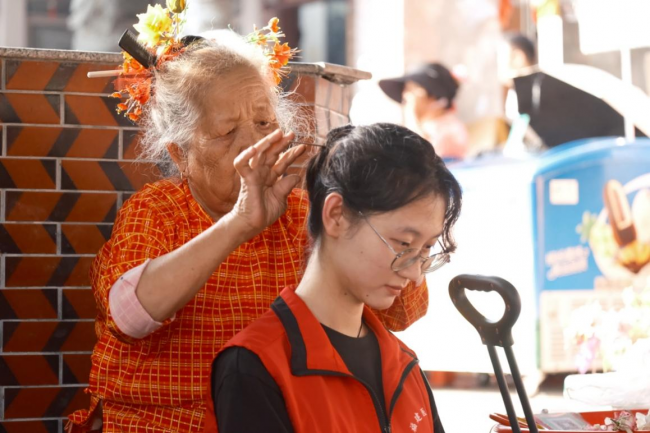 實踐首日,隊員們便沉浸在濃郁的海洋文化氛圍中。走進蜚聲海內(nèi)外的蟳埔民俗文化村,那獨具特色的“簪花圍”仿佛將春天永遠(yuǎn)留駐在發(fā)髻之上。滿頭簪花的蟳埔女,或挑擔(dān)行走,或倚門勞作,她們臉上洋溢著樂觀與堅韌的笑容,無聲訴說著漁家兒女與風(fēng)浪搏斗、生生不息的生活哲學(xué)。隊員們體驗簪花,感受那份對生活的熱愛與執(zhí)著,體悟醫(yī)者面對病痛時同樣需要的堅韌力量。