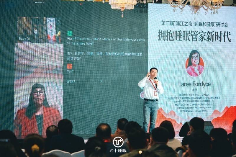 在對(duì)話環(huán)節(jié),乙十睡眠互聯(lián)網(wǎng)醫(yī)院院長(zhǎng)于劍扉博士還通過(guò)視頻連線,與遠(yuǎn)在加拿大的美國(guó)睡眠技師協(xié)會(huì)前任主席Laree Fordyce圍繞“全球視野下的睡眠管理”展開(kāi)深入交流,并現(xiàn)場(chǎng)解答了觀眾關(guān)于“睡眠管家”的提問(wèn)。