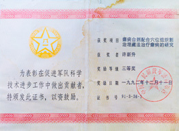 在南疆前線一年多的日子里,他和戰(zhàn)友們整天都在隆隆炮聲陪伴下的貓耳洞中度過。許新升擔任前沿陣地“一線救護所”所長,他深感肩上的責任重大,既要保護和管理好救護隊隊員的安全,又要確保救治傷員任務的順利完成,隊里十幾名救護隊員,大都是年輕人,只有他年齡最大。每一次戰(zhàn)斗,他都是冒著槍林彈雨與炮火跑在救護隊的前面,把最危險的任務留給自己,把生的希望留給戰(zhàn)友。有一次在 122 高地一次戰(zhàn)斗中,彈片像雨點般地打在救護所陣地上,在炮火延伸的間隙,許新升根據(jù)自己的戰(zhàn)場經(jīng)驗,把所里 13名隊員果斷轉(zhuǎn)移到一個比較安全的洞中,剛撤完,緊接著一發(fā)炮彈又落在了撤出的救護所上,避免了一次大的傷亡。在南疆前線的防御作戰(zhàn)中,他帶領(lǐng)救護隊員們救治傷員 180 多人,完成了戰(zhàn)地救護任務,履行了一位軍醫(yī)戰(zhàn)場救護的神圣職責。