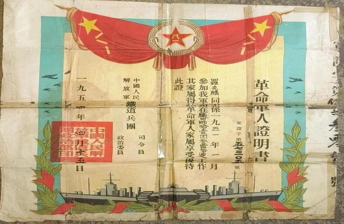 羅克林,1928年10月出生,1951年1月參軍到鐵道兵四師11團(tuán)三營十連任衛(wèi)生員,1954年4月15日復(fù)員回鄉(xiāng)被安置到衛(wèi)生系統(tǒng)工作。