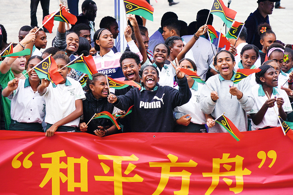 “和平方舟”號(hào)醫(yī)院船抵達(dá)瓦努阿圖共和國維拉港,當(dāng)?shù)孛癖娫诖a頭迎接  新華社發(fā) 徐小龍/攝