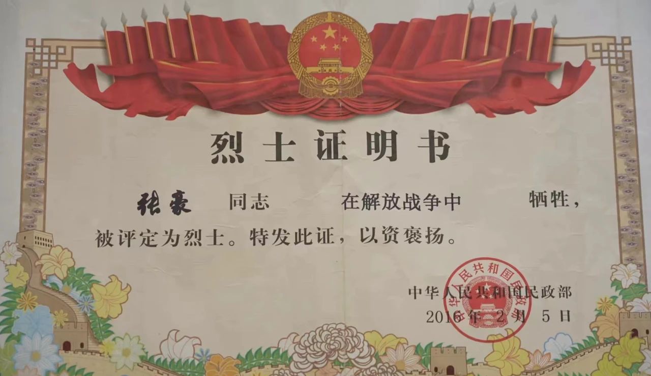 農(nóng)歷1948年,等啊等,全家人望眼欲穿等著他凱旋歸來。等到新中國(guó)成立后的1950年,等來的卻是一張?jiān)卩l(xiāng)里工作的鄉(xiāng)親帶回來的報(bào)紙,上面寫著潘蕩區(qū)沙莊鄉(xiāng)沙莊村(張豪家鄉(xiāng)),39軍115師343團(tuán)宣教股長(zhǎng)張豪, 1948年12月,在解放天津戰(zhàn)斗中犧牲。當(dāng)年沙莊村, 張氏現(xiàn)役軍人有2位,兩戶張氏軍屬無法認(rèn)定張豪烈士就是自家親人。幾個(gè)月后,同村的另外一位張姓軍人復(fù)員回鄉(xiāng),區(qū)鄉(xiāng)村這才確定,報(bào)紙上平津戰(zhàn)役中犧牲的沙莊村張豪就是張登林。當(dāng)區(qū)鄉(xiāng)政府把確認(rèn)結(jié)果告訴張豪母親的時(shí)候,真的是晴天霹靂!三年三代三個(gè)頂梁柱就相繼離世,烈士母親悲痛欲絕,當(dāng)場(chǎng)就哭暈了過去??h民政局憑這張報(bào)紙和區(qū)鄉(xiāng)村證明辦理了張豪《革命烈士證明書》。