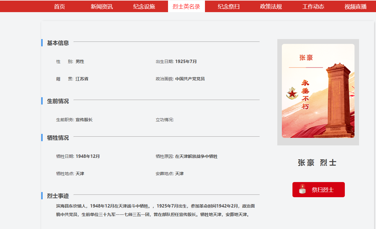 犧牲日期:1949年1月15日1時(shí)許(農(nóng)歷1948年臘月17日)。