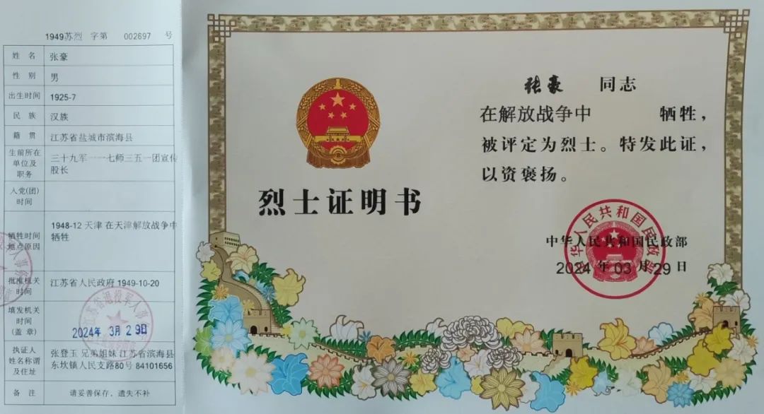 2024年3月29日,江蘇省退役軍人事務(wù)廳更正換發(fā)濱??h新四軍戰(zhàn)士張豪《烈士證明書》。