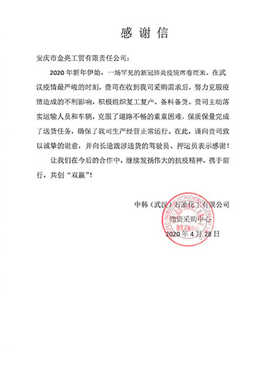 中韓(武漢)石油化工有限公司發(fā)來感謝信