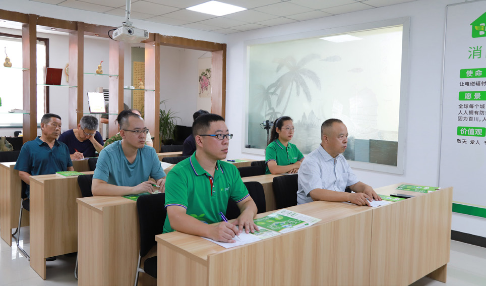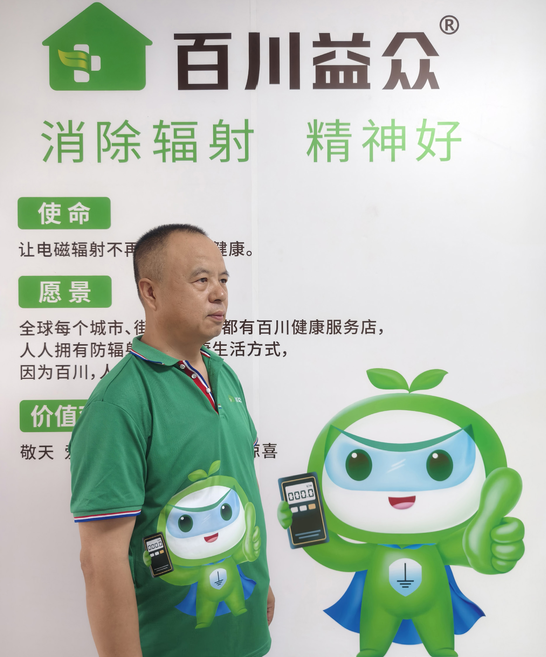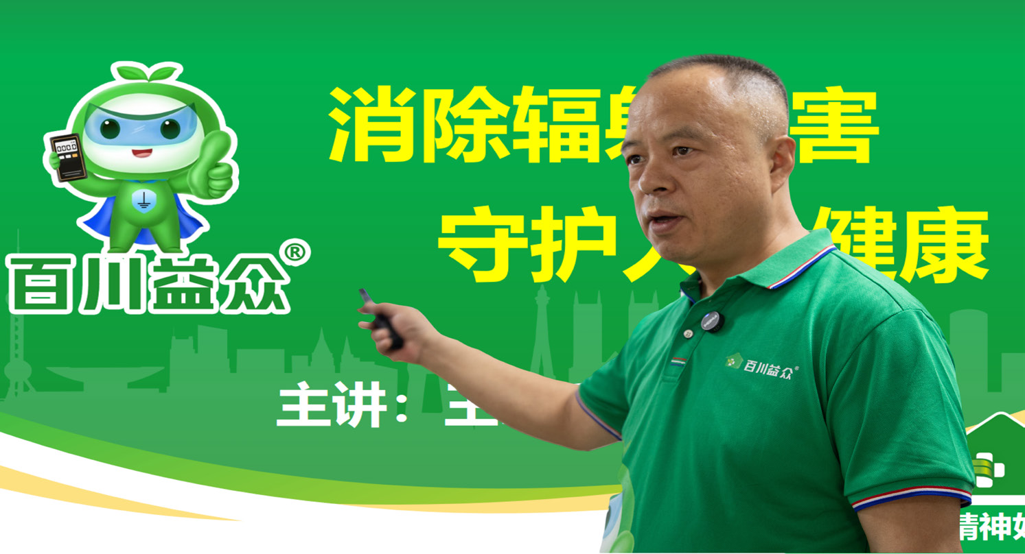 在企業(yè)文化墻前,王海向筆者介紹道:“你看,這個卡通形象很有精氣神,名叫‘神寶’,寓意‘神氣寶貝’,是咱們‘百川益眾’的品牌象征,它頭上長著兩片綠葉,戴著透明的護眼罩,胸前有個畫著接地符號的護心盾牌,腳踩大地,右手握著顯示數(shù)據(jù)是0的電磁輻射測試儀,左手豎起個大拇指點贊?!敝螅^續(xù)介紹說:“在2020年—2022年這3年疫情期間我看了很多書,2023年還考了個‘高級健康管理師’。在發(fā)電廠,我是做強電的,干的是高壓電;如今搞大健康,為了做電子元器件,開始研究弱電。”電磁輻射是什么?王海解釋道:“指能量以電磁波的形式在空間傳播。1831年,英國科學(xué)家法拉第發(fā)現(xiàn)‘磁能生電’,這便是電磁感應(yīng)。同一年,法拉第根據(jù)電磁感應(yīng)發(fā)明圓盤發(fā)電機,讓人類開始了人造電的工業(yè)化生產(chǎn),標志著人類進入了電磁時代。我認為,電磁輻射污染、身體遠離大地,是近幾十年來中國孩子們的體質(zhì)斷崖式下降尤其是近視眼猛增的主要原因?!?/span>