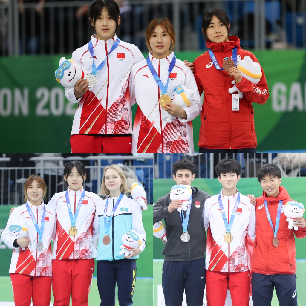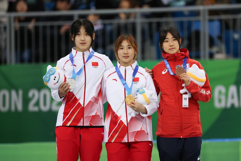 ??1月20日,冠軍中國(guó)選手楊婧茹(中)、亞軍中國(guó)選手李金恣(左)與季軍日本選手井上暖乃美在頒獎(jiǎng)儀式上合影。新華社記者 許雅楠 攝