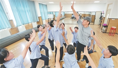 趙海龍(右二)和學生一起排練。霍亞平攝