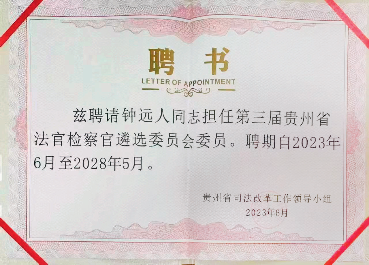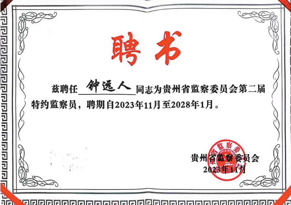 2023年6月,鐘遠(yuǎn)人當(dāng)選為貴州省第三屆法官檢察官遴選委員會(huì)委員,2023年11月,他當(dāng)選為貴州省監(jiān)察委員會(huì)第二屆特約監(jiān)察員,2024年6月,他又當(dāng)選為貴州省檢察官懲戒委員會(huì)委員,促使他在法治建設(shè)領(lǐng)域和監(jiān)察監(jiān)督職責(zé)的角色與責(zé)任進(jìn)一步升級(jí)。他著眼于司法領(lǐng)域的深化改革,致力于優(yōu)化司法資源配置,提升司法隊(duì)伍素質(zhì),為構(gòu)建更加公正、高效、權(quán)威的社會(huì)主義司法制度而不懈努力。