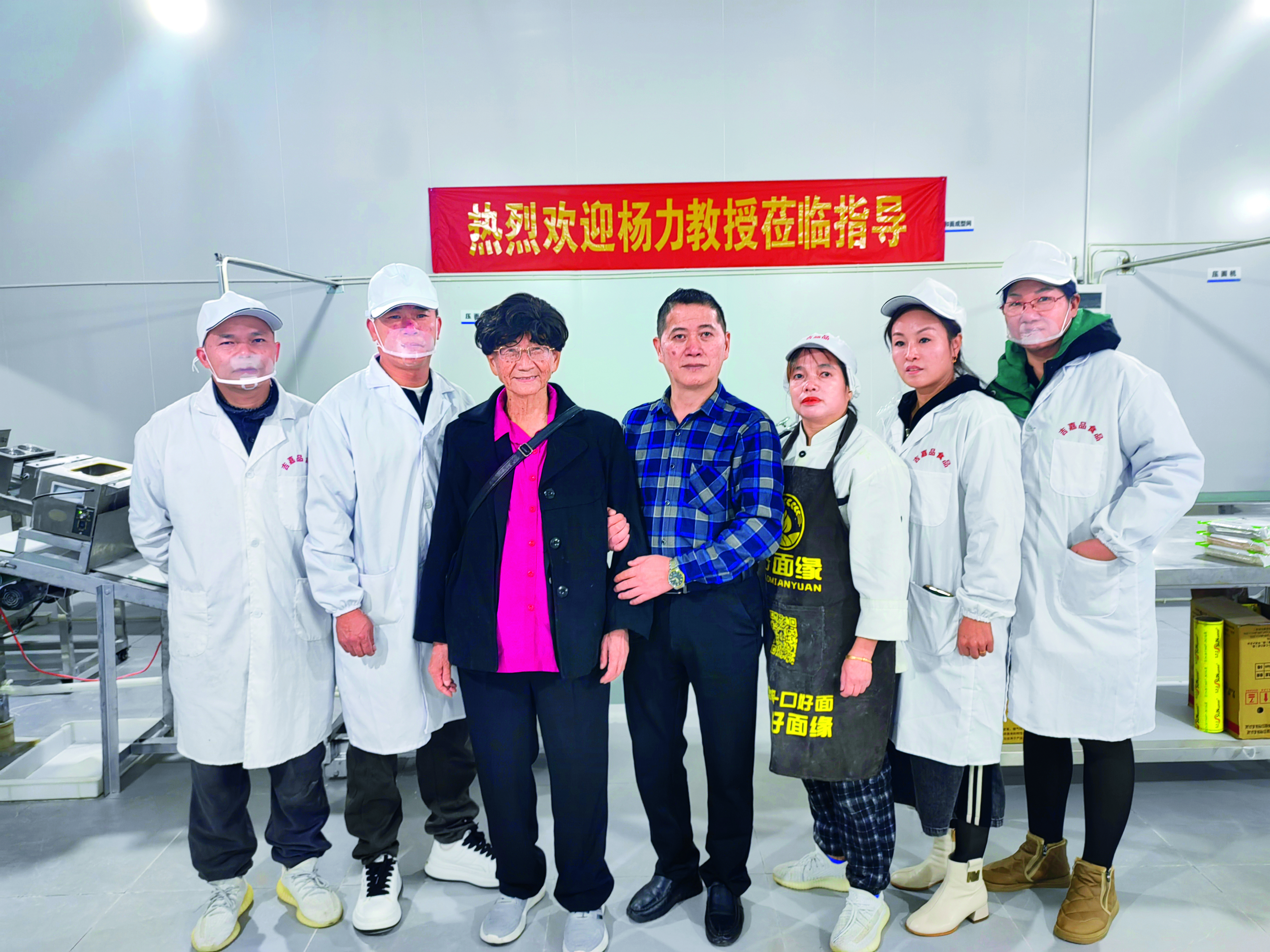 中國(guó)中醫(yī)科學(xué)院研究生院楊力教授(左三)參觀面條生產(chǎn)車間時(shí)與工作人員合影