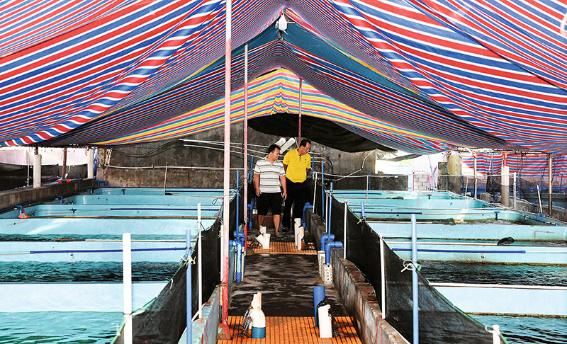 為探尋轉(zhuǎn)型,王書茂(右)在潭門村的一處養(yǎng)殖基地調(diào)研