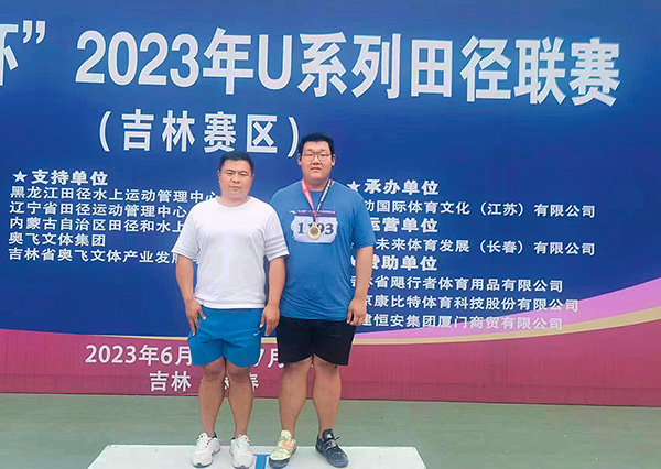 所培養(yǎng)的學(xué)生獲得全國U系列田徑賽男子鉛球第一名。徐興與王藝哲合影