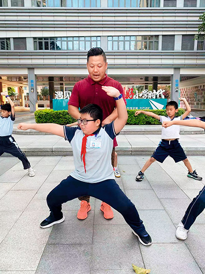 武術(shù)傳承,從娃娃抓起。叢濤在指導(dǎo)小朋友練武術(shù)