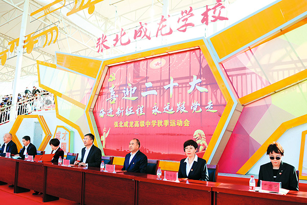 2022年9月28日,張北縣人大常委會副主任侯生莉(右五)、張北縣委教育工委書記、教體科局黨組書記侯建平(右四)、張北縣教體科局局長趙有龍(右六)參加成龍學(xué)校秋季運(yùn)動會開幕式