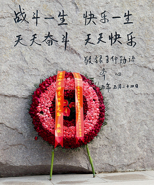 2013年10月15日,習(xí)仲勛陵園內(nèi)擺放的習(xí)仲勛夫人齊心率兒孫敬獻(xiàn)的花籃,習(xí)仲勛墓地坐像背面鐫刻的16個大字為齊心親筆題寫 中新社記者 張遠(yuǎn)攝
