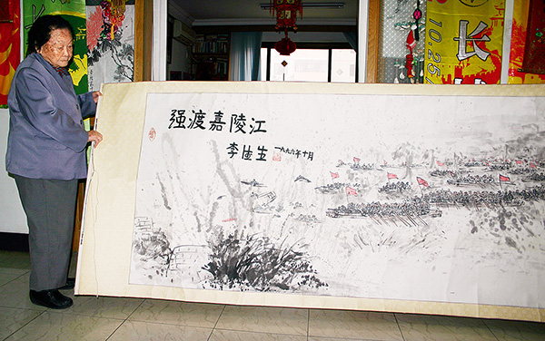 2007年3月11日,王定國和她的畫作《強(qiáng)渡嘉陵江》 中新社發(fā) 郭海鵬攝