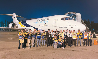 中國飛機租賃集團向印度尼西亞翎亞航空交付的第三架國產(chǎn)噴氣式ARJ21飛機于5月31日傍晚抵達印尼首都雅加達。這是國產(chǎn)飛機的首單人民幣跨境結(jié)算交易。圖為在印度尼西亞雅加達蘇加諾—哈達國際機場,工作人員在國產(chǎn)噴氣式ARJ21飛機前合影。印尼翎亞航空供圖(新華社發(fā))