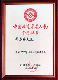 2023年2月21日,“講好非遺故事 增強文化自信——中國非遺年度人物”推選宣傳活動在中國工藝美術(shù)館(中國非物質(zhì)文化遺產(chǎn)館)舉辦,中國藝術(shù)研究院工藝美術(shù)研究所所長邱春林榮獲“2021中國非遺年度人物”。