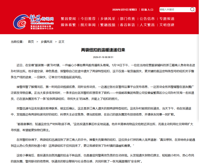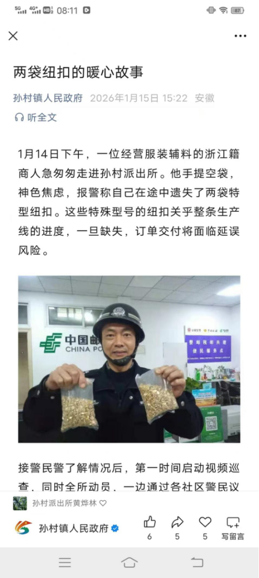 兩袋不起眼的紐扣,背后連著生產(chǎn)線的緊迫與商人的焦慮。安徽省蕪湖市繁昌區(qū)孫村派出所民警接報(bào)后,沒(méi)有因其“事小”而輕視,立即全所動(dòng)員,線上線下同步發(fā)力。從視頻巡查到警民平臺(tái)發(fā)布,從朋友圈擴(kuò)散到迅速核實(shí)線索,短短數(shù)小時(shí)內(nèi),這場(chǎng)高效協(xié)同的尋物行動(dòng),不僅找回了急需的生產(chǎn)物資,更守護(hù)了一位異鄉(xiāng)創(chuàng)業(yè)者的信心。這正是“一枝一葉總關(guān)情”的生動(dòng)寫照——人民警察將百姓的每件“小事”都當(dāng)作心頭“大事”,于細(xì)微處見(jiàn)真情,于急難中顯擔(dān)當(dāng)。