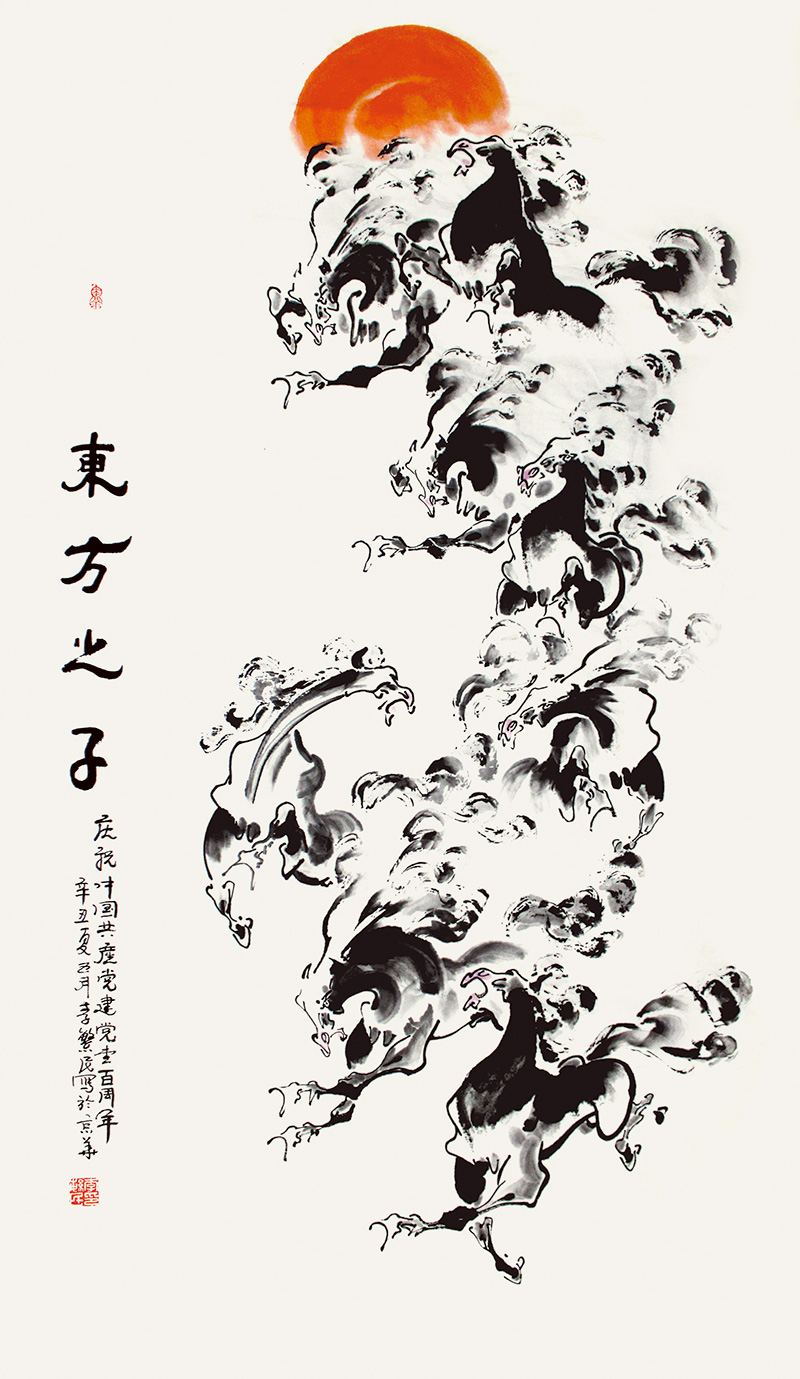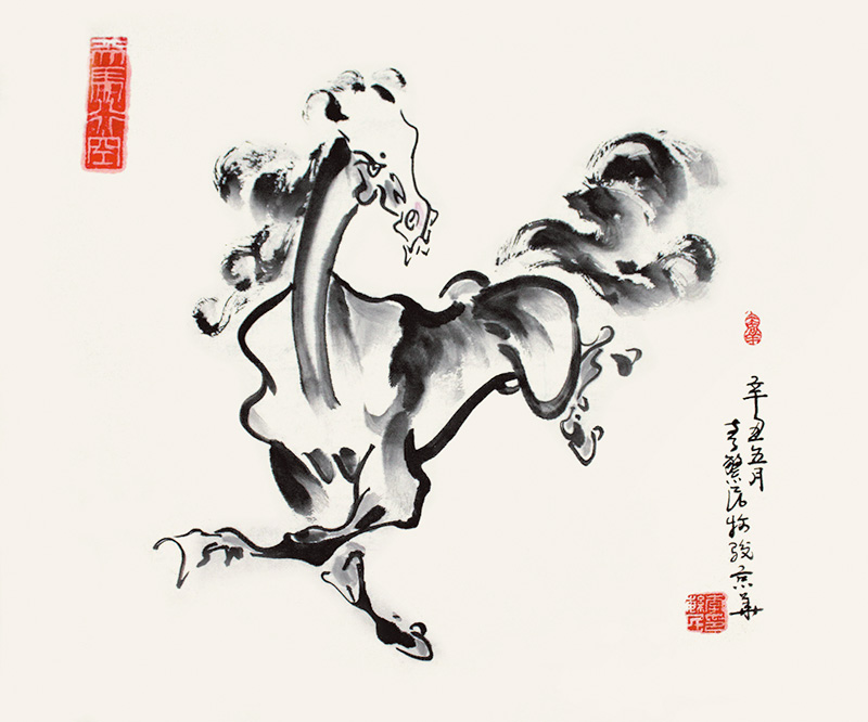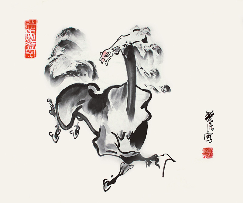 主題確定了,要靠藝術(shù)手法來升華畫馬的精神內(nèi)核,為畫馬塑魂明志。2009年,央視書畫頻道組織畫家前往震后汶川慰問,李繁民有幸結(jié)識西北畫家劉文西,向劉文西老師求教畫馬之道。劉文西老師說:以馬為師,多多寫生,畫出馬的精氣神來。此后他與劉文西老師結(jié)下了近十年的師生情緣,直到劉文西老師去世。李繁民謹(jǐn)遵劉文西老師指點,通過長期摸索,反復(fù)實踐,終于開拓出一條青出于藍(lán)而勝于藍(lán)的畫馬之路。道法自然,鮮活的生命,絢麗的生活,多彩的大自然,永遠(yuǎn)是藝術(shù)家最好的老師。李繁民總覺得天上的“龍”和地上的“馬”雖然虛實相生,卻有著異曲同工之妙。奔馬身似龍騰,馬首形似龍頭。成語有畫龍點睛,他畫馬時,刻意將馬的眼眸提高,圓圓地一點到位,天目大開,神韻頓生。李繁民研究陳大羽先生畫雄雞作品時,茅塞頓開:金雞獨立,全憑堅挺的肌肉和骨骼,還有鷹爪般的雙足;揚起的眼喙,抖擻的鳳尾,無不傳達(dá)著樂觀向上的神采,駿馬馳騁何嘗不是如此呢?他濃墨重彩地畫馬的鋼筋鐵骨。“扣碗式”的馬蹄擲地有聲,踏響鼓點般鏗鏘的節(jié)奏;凌空而起的馬蹄好似漁夫拋撒出去的漁網(wǎng),伶俐的曲線搖曳著歡動無限的韻律美;旨在表現(xiàn)“天馬行空,獨來獨往”的疾蹄之功,迥乎不同于“淺草才能沒馬蹄”的閑適畫風(fēng)。