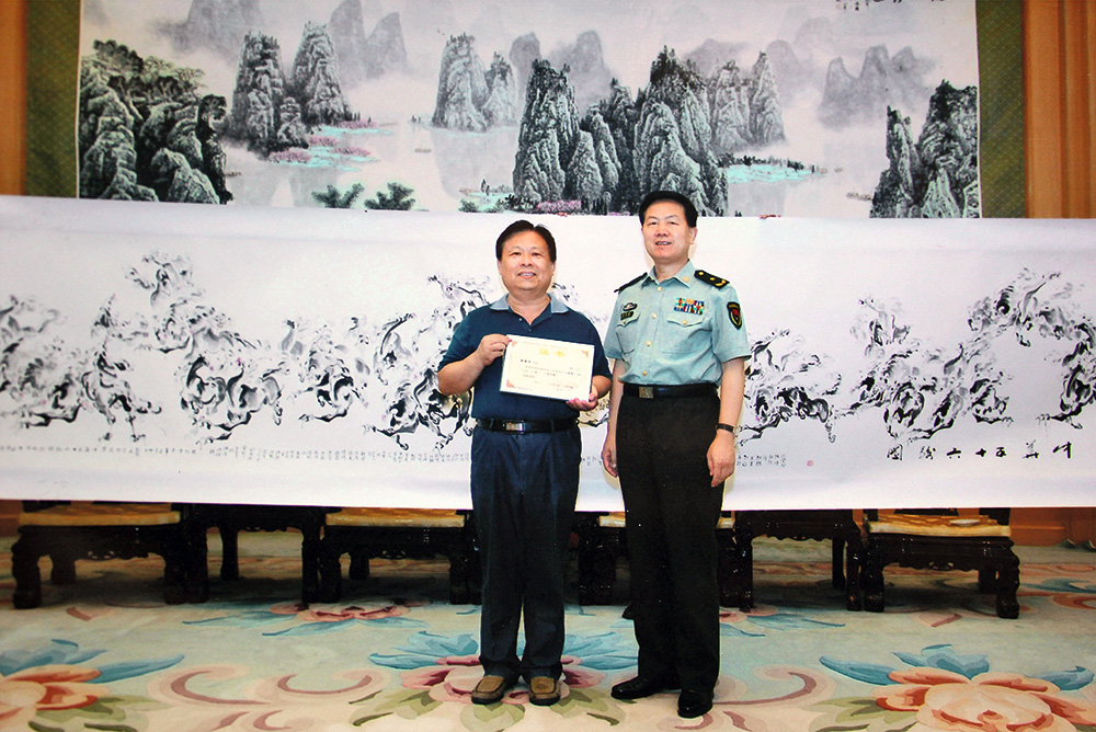 有道是,做事先做人,德不壓藝,德藝雙馨。真正的藝術(shù)家執(zhí)著于以德養(yǎng)藝、以藝明德。即使是造詣高深的藝術(shù)家,如果德之不古,那么其作品也會黯然失色。李繁民先生既從藝,又修德。他熱衷投身于中國殘疾人公益事業(yè),活動中捐畫、贈畫、現(xiàn)場作畫,但分文不取,募捐款項全部奉獻(xiàn)給助殘事業(yè)。他胸懷軍人情結(jié),長年活躍于原部隊、王杰部隊、烈士紀(jì)念館、抗聯(lián)紀(jì)念館等,慰問戰(zhàn)友,捐畫、贈畫、現(xiàn)場作畫。他還向人民大會堂、中央軍委、中國殘聯(lián)等單位贈送畫馬作品。雖然他的《龍騰》作品榮獲中國海峽兩岸名人名家書畫精品展一等獎,畫作潤格每平尺上萬元,但是他秉承重藝輕利的信念,從不借機撈金,有的是對書畫藝術(shù)孜孜以求、勇于創(chuàng)新的拳拳之心,無半點追名逐利、蠅營狗茍的功利之心。