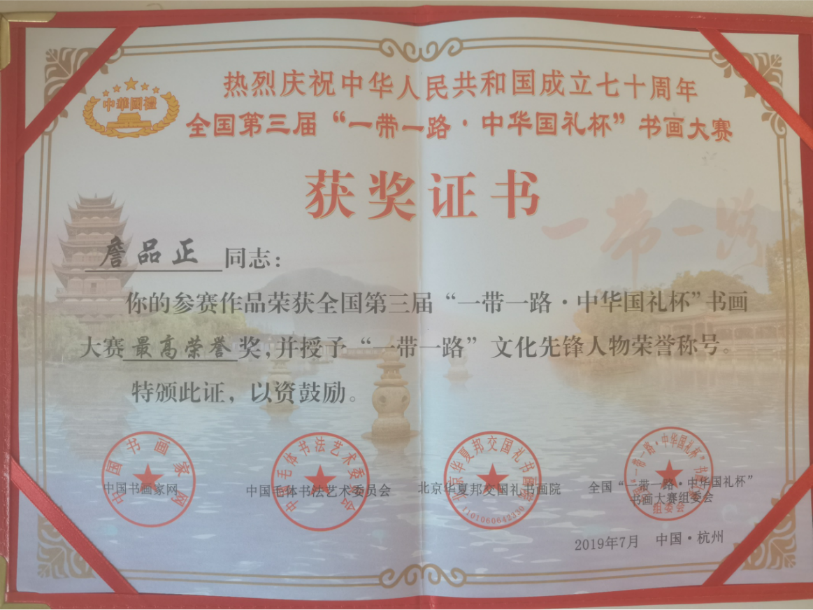 2019年7月書(shū)法作品在全國(guó)第三屆“一帶一路·中華國(guó)禮杯”書(shū)畫(huà)大賽中,榮獲最高榮譽(yù)獎(jiǎng),并授予“一帶一路文化先鋒人物”榮譽(yù)稱(chēng)號(hào)。