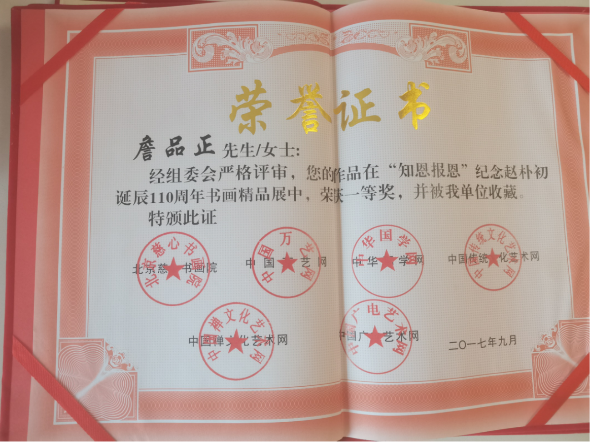 2017年9月書(shū)法作品在“知恩報(bào)恩”紀(jì)念趙樸初誕辰110周年書(shū)畫(huà)精品展中,榮獲一等獎(jiǎng),作品被主辦單位收藏。