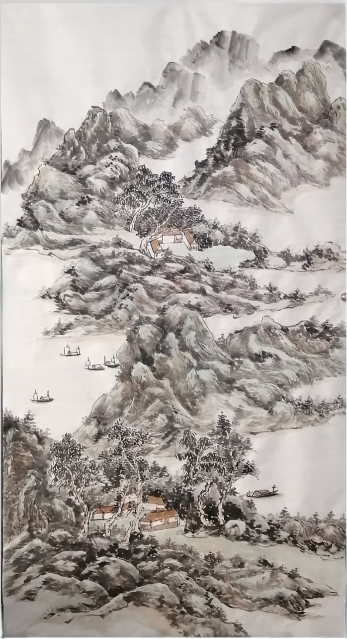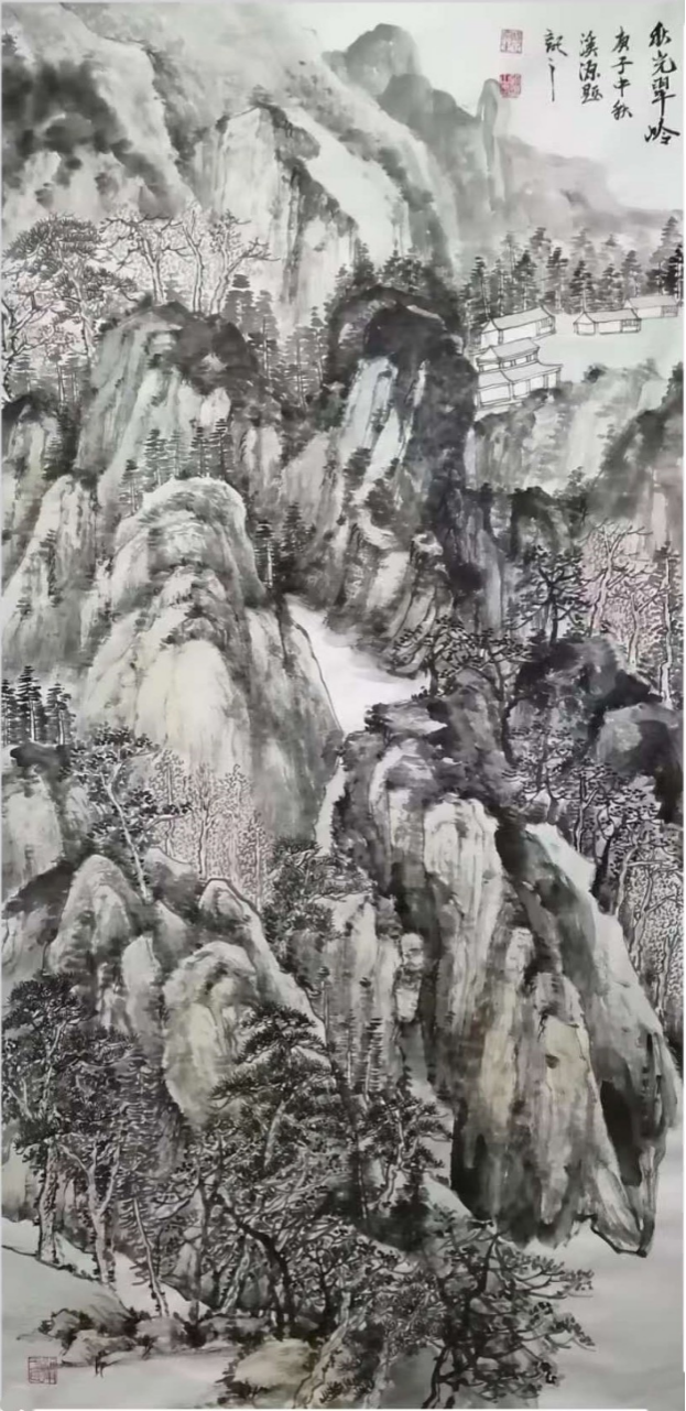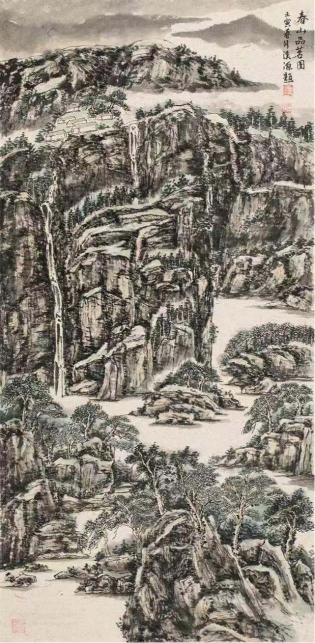 相較于花鳥畫的靈動精微,于利勛的山水畫則盡顯河洛山河的雄渾氣象,其代表作《春山品茗》中,他以“高遠(yuǎn)法”刻畫險峻山巒,山石以濃墨重筆皴擦,借鑒范寬“雨點皴”的厚重質(zhì)感,凸顯龍門石窟周邊山巒的蒼勁風(fēng)骨;中景以淡墨渲染云霧,使山水在虛實之間盡顯層次;遠(yuǎn)景則以留白營造天際的遼闊,讓伊洛河的蜿蜒流淌隱于煙嵐之中,達(dá)成了“咫尺山林,萬里江天”的藝術(shù)效果。在筆墨技法上,于利勛深諳“書畫同源”之道,將河洛書法的骨力融入繪畫線條之中。這種文脈滋養(yǎng)讓他的山水線條兼具遒勁與靈動之美一一勾勒山石時,線條如魏碑般沉雄有力;描摹流水時,筆觸似行書般流暢自然。于利勛的創(chuàng)作無疑踐行了這一藝術(shù)宗旨。他的花鳥,是對自然生命的細(xì)膩體悟,更是對民俗溫情的生動傳遞;他的山水,是對河洛山河的精準(zhǔn)描摹,更是對地域文化根脈的深刻守望。