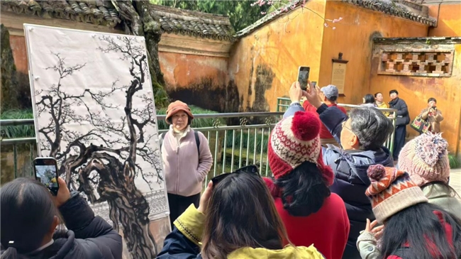 “章安手植的千年古梅虬曲蒼勁,繁花映黃墻,一筆一畫定格這份跨越千載的梅韻寺香?!痹S偉清在國(guó)清寺的黃墻前支起畫架,完成了這次萬里尋梅的最后一幅作品。