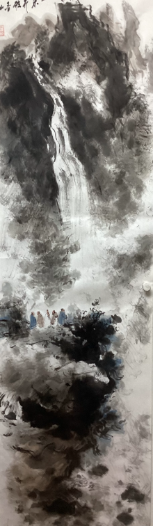 他和鄉(xiāng)友書畫家岑其有過一次《佛道禪心》聯(lián)展,這次展覽非帝成功,而且岑其先生的學(xué)識和藝術(shù)修養(yǎng)對他有極大幫助,這個使他藝術(shù)之路走上了一個新臺價。細(xì)觀章安君的山水畫卷,會發(fā)現(xiàn)一個鮮明的精神標(biāo)識:在蒼茫云水之間,總有一組或三二高士,或觀瀑沉吟,或臥石靜思,或雅集論道?!爱嬌剿耐c景人物畫不好,我的山水往往有一組或三、二高士……這些人物我反復(fù)畫了幾千個爛熟與心?!?nbsp;這種對“人”的執(zhí)著,源于他內(nèi)心深處“天人合一”的哲學(xué)追慕。在他看來,山水是天地之骨,而人物是山水之魂。那些重復(fù)了數(shù)千次的高士,不是簡單的點景符號,而是他將個體生命置于浩渺宇宙中進(jìn)行觀照的媒介,在千巖萬壑間完成人與天地精神相往還的對話。