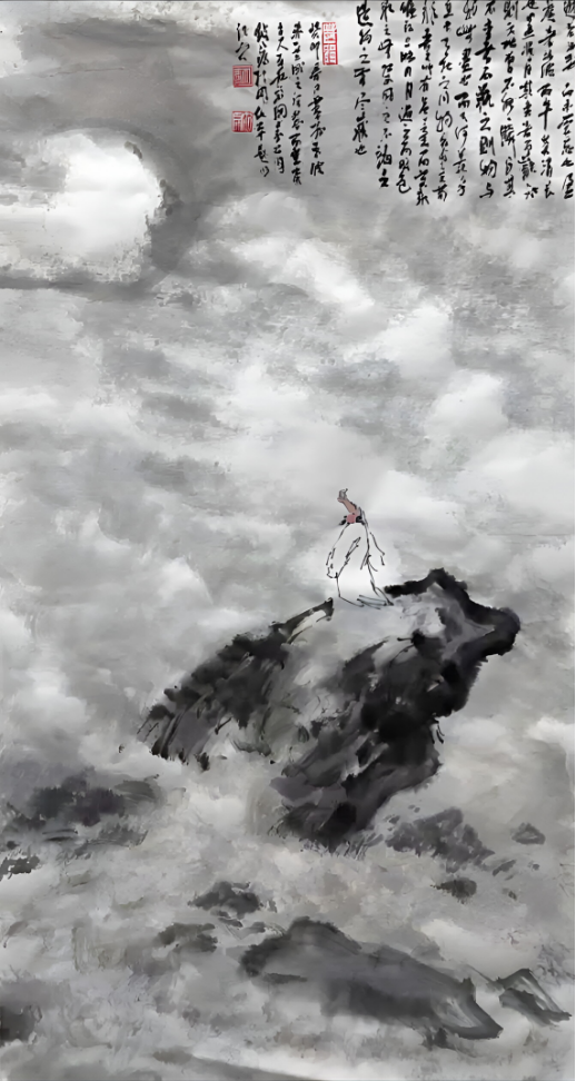 但一次上海朵云軒的一次邂逅則是撼動靈魂的雷霆“看到傅抱石真跡畫作,非常震憾,其畫風(fēng)激揚澎拜、人物高古蒼涼?!?nbsp;那一刻,紙上的筆墨不再是靜默的技法,而是化作排山倒海般的生命律動。章安君當(dāng)即購下大量傅抱石著述閉門研習(xí),這位金陵畫派宗師的“抱石皴”與高古人物,在他心中種下了“以氣韻馭筆墨”的種子。這次頓悟成為他藝術(shù)生涯的關(guān)鍵轉(zhuǎn)折點,讓他徹悟:真正的繪畫不是物象的描摹,而是胸中塊壘的傾瀉,是“高古蒼涼”四字所承載的千年文脈。