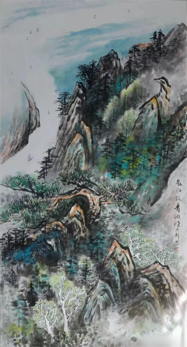他對藝術(shù)的思考,早已超越了技法的層面,進(jìn)入了“為什么畫”的哲學(xué)追問。在創(chuàng)作環(huán)保題材作品《長江泛青煙》時,他為了表達(dá)習(xí)近平總書記“綠水青山就是金山銀山”的科學(xué)論斷,精心構(gòu)思:畫面上將長江置于上方且向東流,寓意“一江碧水向東流”的戰(zhàn)略目標(biāo);將石頭意象化為候鳥,帶著感恩的心態(tài)遠(yuǎn)眺首長的考察船。在技法上,他不僅運(yùn)用傳統(tǒng)的勾皴擦點(diǎn)染,還大膽借鑒西畫的透明薄涂和不透明厚涂法,生動展現(xiàn)出綠茵江邊與懸崖苔蘚的生態(tài)效果。這種將宏大敘事與精微技法結(jié)合的創(chuàng)作方式,讓他的作品充滿了時代感。