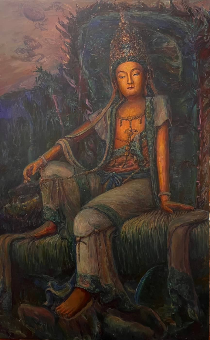 以新作《紫竹觀音像》為例,這幅油畫詮釋了對安岳紫竹觀音像的禮贊。王般若在保持石窟歲月感的同時(shí),大膽融入富有生命力的色彩,讓“瑞紫與竹青在光影里低語”。 她自述創(chuàng)作思緒:“光漫過紫竹,觀音照我心,是風(fēng)拂過油畫布的剎那,慈悲從礦彩中蘇醒,瑞紫與竹青在光影里低語。我想畫一尊觀音——以油彩的濃郁,承載東方禪意的空靈。讓紫竹不再是背景,而是她灑向人間的甘露情!”油畫的厚重托起禪意的空靈,神性在色彩與光影中自然流淌、生息。這份對佛教文化的專題性探索,被她視為“一色一彩,皆為供養(yǎng)”。