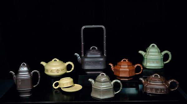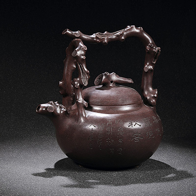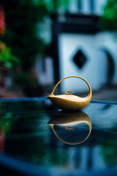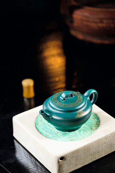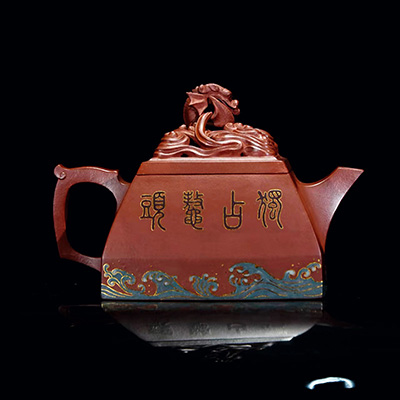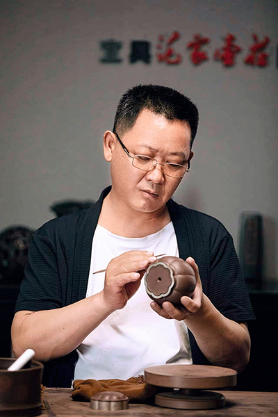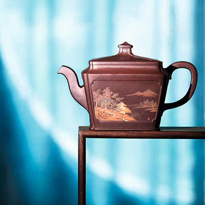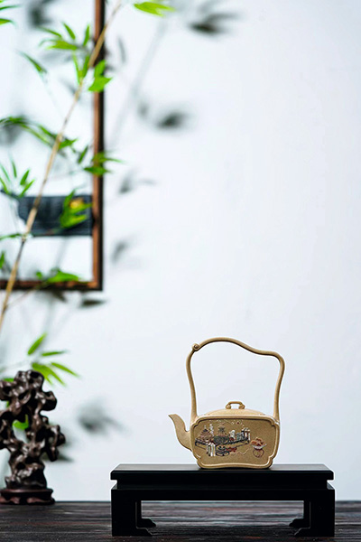 秉承文正家風(fēng)之耕讀傳家。如今,他的作品有兩條主線:一條是傳承,以歷史作品為原型,進(jìn)行二度創(chuàng)作;另一條則是創(chuàng)新,目前已達(dá)百余個(gè)新品,創(chuàng)作靈感豐富的令人羨慕。“我的創(chuàng)新品風(fēng)格多樣,不拘泥于一個(gè)種類”。因?yàn)槎嗄陙韺?duì)于器、型、款、裝飾都已了然于心,他的創(chuàng)新顯得非常游刃有余,并不拘泥于器型,也不拘任何裝飾手法,“我的創(chuàng)作語言比較寬泛,有完全現(xiàn)代的,線條、形體的,也有傳統(tǒng)壺型搭配新藝術(shù)、裝飾的,也有新興創(chuàng)作雕刻、泥繪、鑲金等工藝的?!?/p>