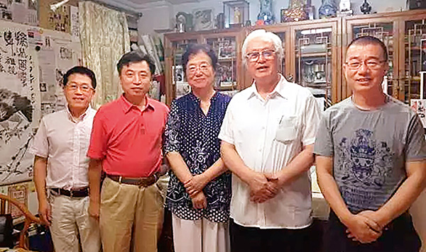 《百年巨匠》出品人、總策劃楊京島,《百年巨匠》美術(shù)篇第四部總導(dǎo)演梁碧波,《百年巨匠》策劃總監(jiān)丁吉林與李苦禪兒子李燕、孫燕華夫婦合影