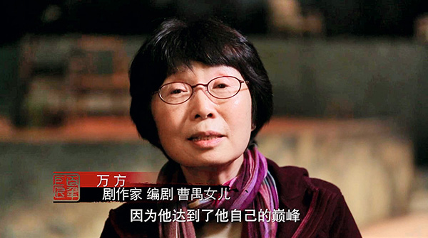 在紀錄片的制作過程中,曹禺的女兒萬方應邀出鏡接受采訪,并參與到敘事當中。有了這層情感上的鏈接,敘事便又多了一重溫度和親切感。萬方很早就開始了寫作,創(chuàng)作有《空鏡子》等小說和經(jīng)典影視劇作品,如今也接過父親的衣缽走上了話劇創(chuàng)作的道路。從她的視角看來,父親的創(chuàng)作有一種沖動的力量,“希望能夠掙脫他的心靈,他的渴望,他對美好的東西有一種追求,一種激情”,“要用自己的力量來表達心里對這個社會、整個世界的感受”。