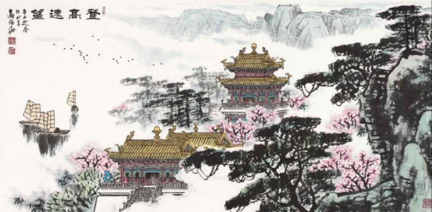 《九洲攬勝》、《瓊樓仙侶圖》、《江樓夜月圖》等作品在構圖、宮殿建筑刻畫方面均新穎獨到,乘古而不泥古,汲取現(xiàn)代手法融而不露?!洞航ㄔ乱埂贰ⅰ缎⊥ひ嘤性隆方允侨宋?、界畫、山水結合的作品,在這些作品中我們看到了他突破了古代界畫呆板的弱點,以樓閣亭臺為主體,刻畫傳神。他深感祖國河山之美,其《滕王閣圖》、《頤和園》、《武當山勝跡》充滿激情地描繪雕梁,斗拱,飛檐,或蟠龍繞柱,或菁華帝闕,氣象萬千。他的山水作品構圖飽滿,墨色沉冥變幻,蒼茫厚重,靜穆博大的巍巍群山……這些代表作無疑是畫家崇高人格與精神的表征,讓我們體會到了高福海界畫作品中的風骨與靈魂。