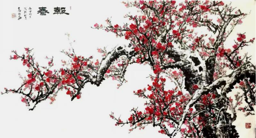 “良賈深藏若虛,君子盛德容貌若愚?!笔赜?,守靜,是高福海為人做事的遵守之道,他自詡為愚鈍之人,將自已的畫室命名為“補拙齋”,取勤能補拙之意。具有天賦能力的高福海在創(chuàng)造過程中從來都不走捷徑,他將自已的聰明收起,用筆嚴謹精確,細致入微,設色或施重彩富麗堂皇;或淺絳淡彩清新典雅。所做樓閣界畫認真不茍,嚴謹精美。對于小寫意作品亦是采用濃淡水墨疊加以達立體,神韻俱足,他創(chuàng)作的《報春圖》中的梅花疏密有致,高低呼應,疏繁相襯,紅花點染綻放,秀逸脫俗。梅干蒼勁挺力,虬曲橫斜,枝杈用墨與花瓣之紅形成對照。兩只山鵲,舞鬧枝頭,啼鳴春澗?;仨櫯伍g,寓意對美好事物的憧憬與期盼,寄托著對友人衷心的祝福。繪畫,在高福海眼里從來就是一種寄托自己才情的媒介,有時候,干脆就是他自己的化身。只有能守住內心寧靜的人,才能發(fā)現(xiàn)生活中的幸福和美吧!