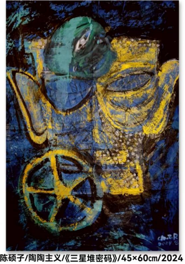 陳碩子的作品風(fēng)格鮮明,她以陶陶主義“非具象、非理性、非主題”為創(chuàng)作哲學(xué)打破傳統(tǒng)繪畫(huà)的框架束縛。她摒棄對(duì)現(xiàn)實(shí)物象的摹寫(xiě)、邏輯思維的限制及特定主題的約束,以大膽跳躍的色彩、奔放灑脫的筆觸、超現(xiàn)實(shí)的構(gòu)圖,構(gòu)建出充滿(mǎn)詩(shī)意的精神宇宙,將潛意識(shí)中的情感與想象化為視覺(jué)符號(hào),傳遞對(duì)生命本質(zhì)的哲思。在她的作品《樂(lè)知》中,色彩的碰撞與交融仿佛奏響一曲無(wú)聲的樂(lè)章引領(lǐng)觀者在藝術(shù)的世界中聆聽(tīng)內(nèi)心的聲音;《織夢(mèng)》以其絢爛的色彩和奇幻的構(gòu)圖,為人們編織出一個(gè)個(gè)瑰麗的夢(mèng)境,激發(fā)著無(wú)限的想象;《獸首巡殤》則通過(guò)獨(dú)特的藝術(shù)語(yǔ)言,表達(dá)出對(duì)生命與歷史的深刻思考。