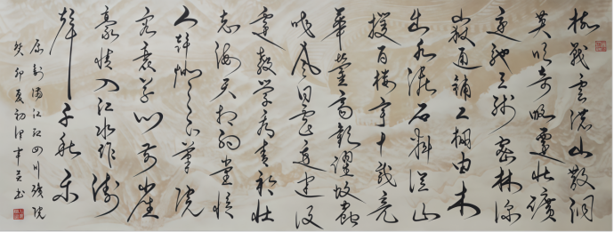 他從青年時起,在毛主席書法藝術(shù)的引領(lǐng)下與翰墨結(jié)緣,在三十多年的學(xué)習(xí)過程中邊學(xué)邊悟,廣學(xué)百家之長,熔經(jīng)典和現(xiàn)代為一爐,集清秀與豪放為一體,將秀美元素融入雄渾豪放的毛體書法,在對傳統(tǒng)毛體書法的風(fēng)格重塑中,創(chuàng)立了別具魅力的“新時代毛體書法”。
