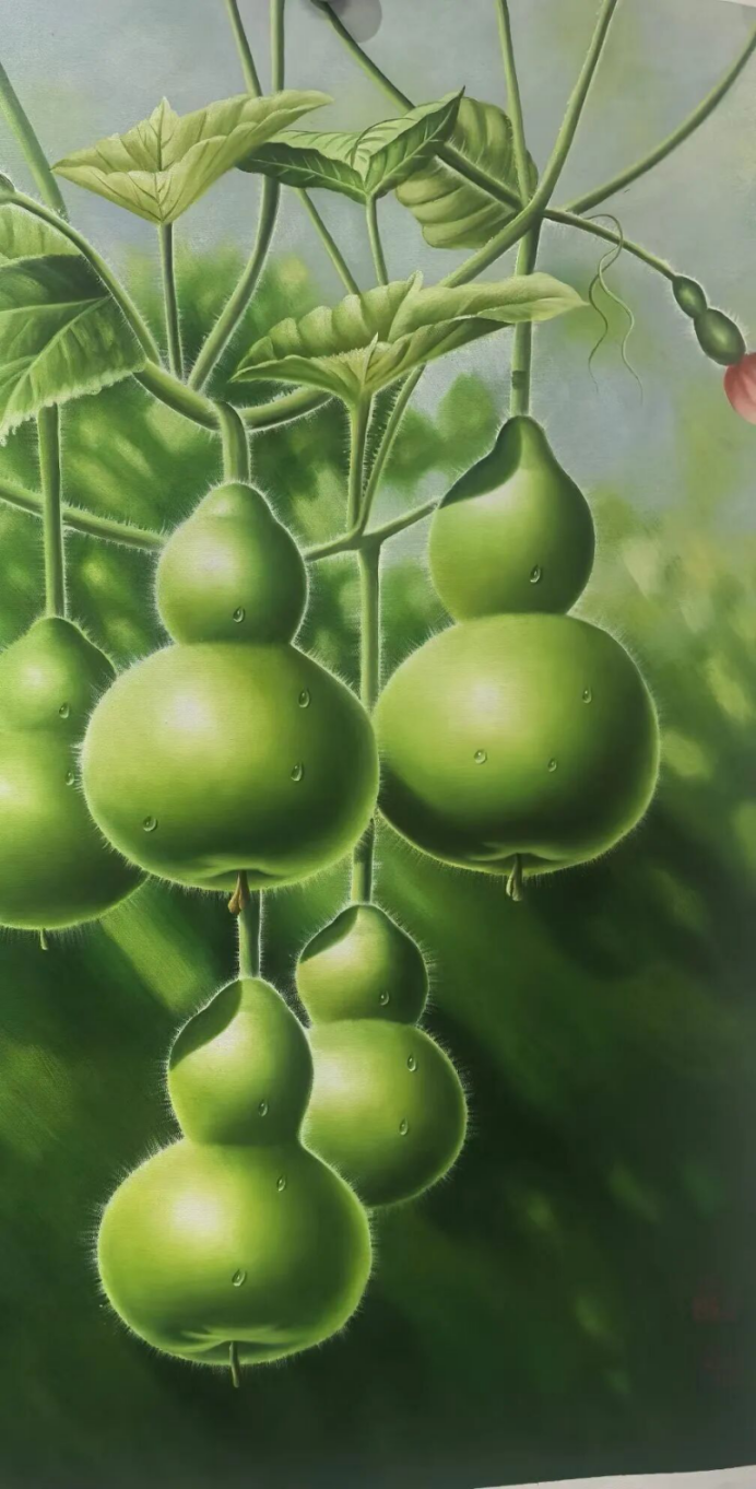 荔枝、葫蘆、白菜等題材,是中國傳統(tǒng)繪畫中的經(jīng)典母題,但在賀天飛筆下,它們被賦予了新的文化內(nèi)涵。飽滿的鮮紅荔枝垂掛成串,翠綠葉子自然舒展,兩只小鳥一展翅一啄食,羽毛色彩斑斕——這并非對“嶺南佳果”的簡單描摹,而是通過“荔枝”的“紅”與“小鳥”的“動”,暗合“人間至味是清歡”的生活哲思。畫中題款“人間最美得紅利”更將“荔枝”從“果”升華為“福祉”的象征,傳統(tǒng)題材由此承載起當代人對“美好生活”的向往。