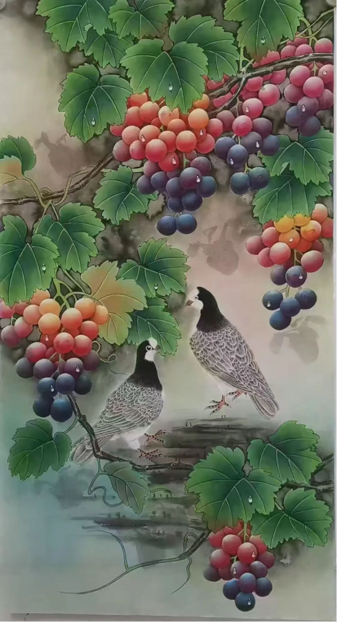 工筆畫是賀天飛藝術的重要語言,尤其在《葡萄松鼠》《荔枝小鳥》《青綠葫蘆》等作品中,其細膩的筆觸與嚴謹?shù)脑煨土钊梭@嘆。如《葡萄松鼠》中,多串葡萄以淡粉、深紫、藍紫分層渲染,每顆葡萄表面的水珠用留白法點綴,既保留了工筆“窮工極妍”的特質(zhì),又通過“水珠”的透明感賦予葡萄“剛被雨水滋潤”的鮮活;松鼠的黃褐毛發(fā)以細筆攢點,背部黑白條紋的漸變處理,連爪子的肉墊都清晰可辨——這種“形似”的追求,最終服務于“神似”的表達:松鼠仰頭的靈動、葡萄垂掛的飽滿,共同傳遞出“自然生機”的核心意象。