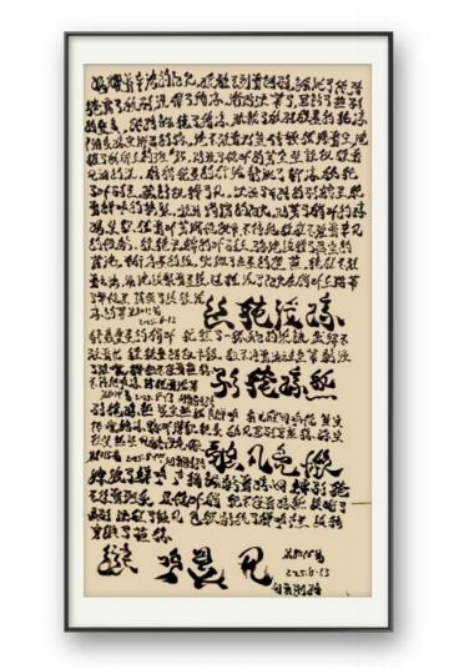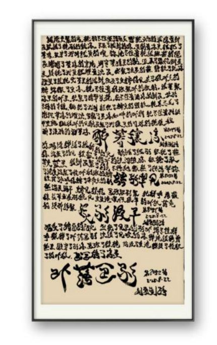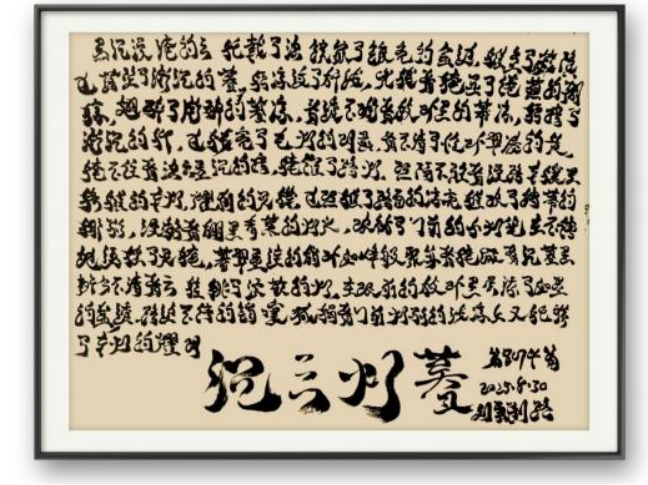 日積月累的練習(xí),讓劉勇形成了獨(dú)具特色的書法風(fēng)格。他的書法作品布局精妙,字行茂密緊湊卻密中見疏,墨色枯潤相間打破密集感,標(biāo)題筆墨夸張醒目,與正文的細(xì)膩形成強(qiáng)烈反差,整體統(tǒng)一中充滿張力。線條蒼勁靈動(dòng),起筆側(cè)鋒切入,行筆提按頓挫分明,粗細(xì)對(duì)比強(qiáng)烈,既兼具碑學(xué)的雄渾力道,又蘊(yùn)含帖學(xué)的流暢意韻,完美詮釋了 “以書載文、以筆抒情” 的創(chuàng)作理念。