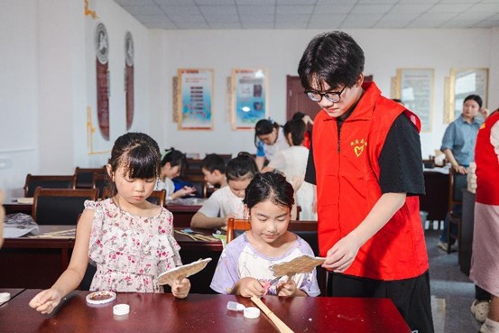 鹽城師范學(xué)院學(xué)生胥清妍、江蘇農(nóng)林職業(yè)技術(shù)學(xué)院學(xué)生樂蘇陽為孩子們介紹蒲扇制作技藝,在了解手工編制方法后進(jìn)行創(chuàng)作,然后運(yùn)用紙、筆、剪刀等工具制作作品,鼓勵(lì)孩子們大膽想象靈活運(yùn)用色彩與圖形,在傳承傳統(tǒng)蒲扇制作技藝中發(fā)現(xiàn)藝術(shù)美。在志愿者的引導(dǎo)和幫助下,孩子們開心地創(chuàng)造著自己的作品,大家也收獲滿滿。