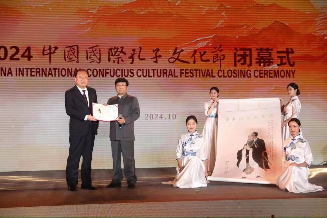 閉幕式上,孔子第78代裔孫、全國(guó)政協(xié)委員、中國(guó)和平統(tǒng)一促進(jìn)會(huì)理事、民革中央畫(huà)院院長(zhǎng)孔維克向2024中國(guó)國(guó)際孔子文化節(jié)組委會(huì)呈獻(xiàn)自己為本屆孔子文化節(jié)特別創(chuàng)作的《先師孔子行教圖》致賀。閉幕式上還宣讀了2024中國(guó)國(guó)際孔子文化節(jié)致敬辭。
