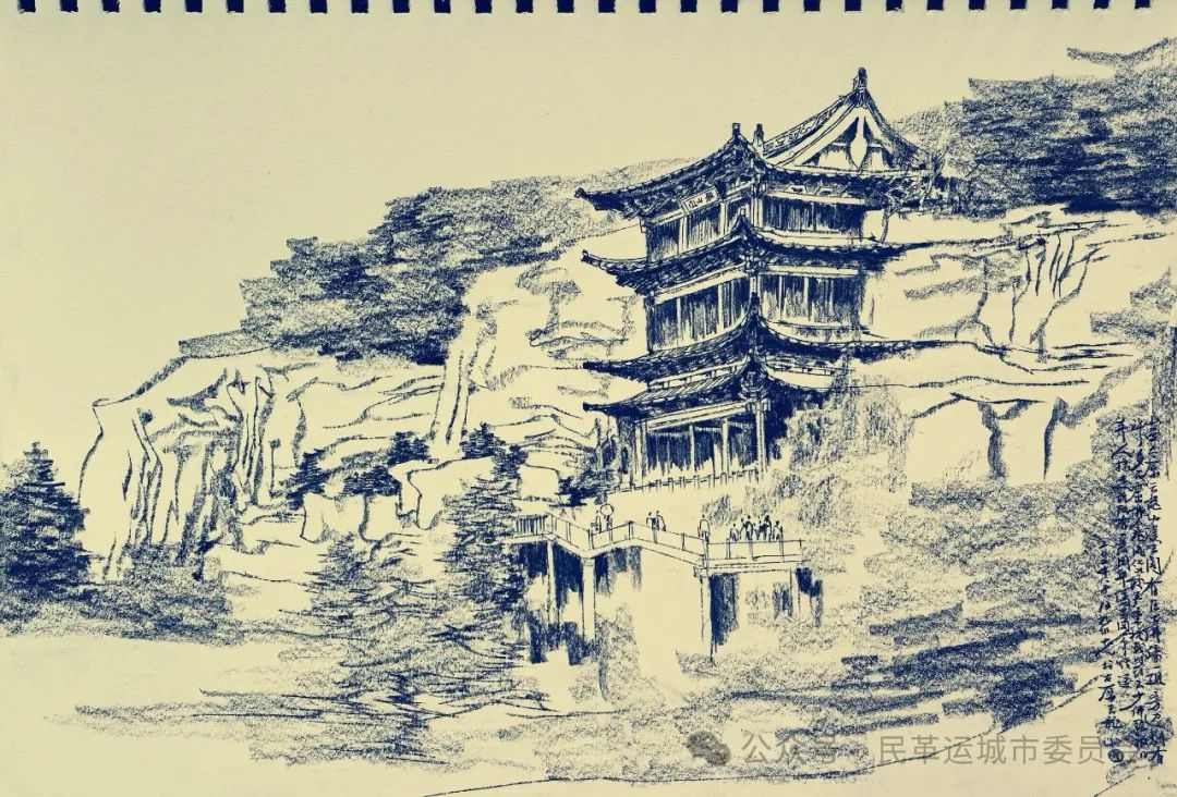 作為本展中國畫評(píng)委會(huì)主任,孔院長于8月9日一14日,走進(jìn)山西運(yùn)城,在評(píng)選作品工作之余帶部分畫家一起走進(jìn)運(yùn)城市郊舜帝陵、司馬溫公祠,芮城永樂宮、解州關(guān)羽故鄉(xiāng),永濟(jì)普救寺、鸛雀樓,及晉祠、漫天閣等,考察山西人文及歷史遺存,畫了一批人文景觀寫生。讓我們隨孔維克院長的畫筆走進(jìn)山西,在這一幅幅畫飛揚(yáng)的線條中,領(lǐng)略畫筆寫出的詩意,在神秘的光影中感受千年歷史的厚重,在優(yōu)美的旋律中欣賞藝術(shù)家的慧心。