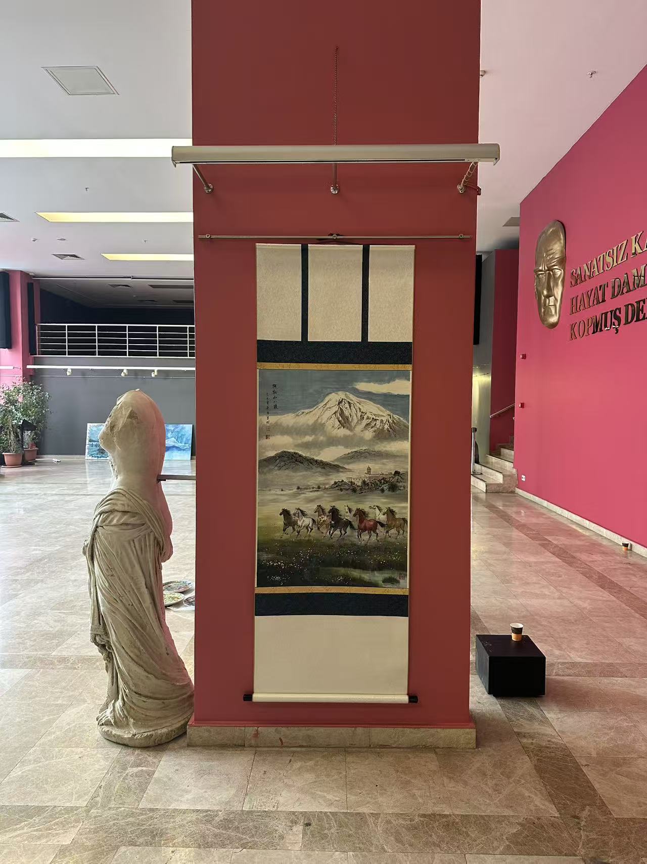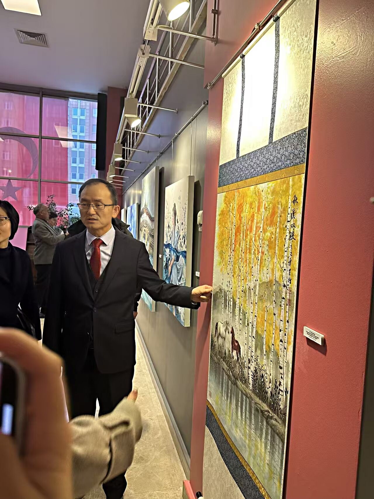 姜學(xué)斌大使親自向嘉賓親自講解李昱春教授參展作品。中外嘉賓紛紛在李教授畫作前駐足欣賞,大家紛紛表示,李教授創(chuàng)作的畫作凸顯“對(duì)話·共融”主題,既有文明傳承又展現(xiàn)了奮發(fā)進(jìn)取的時(shí)代精神,在美學(xué)、美育上與偉大的土耳其文明產(chǎn)生了共鳴,為中土友誼和中土文明交流互鑒注入了澎拜的藝術(shù)力量。